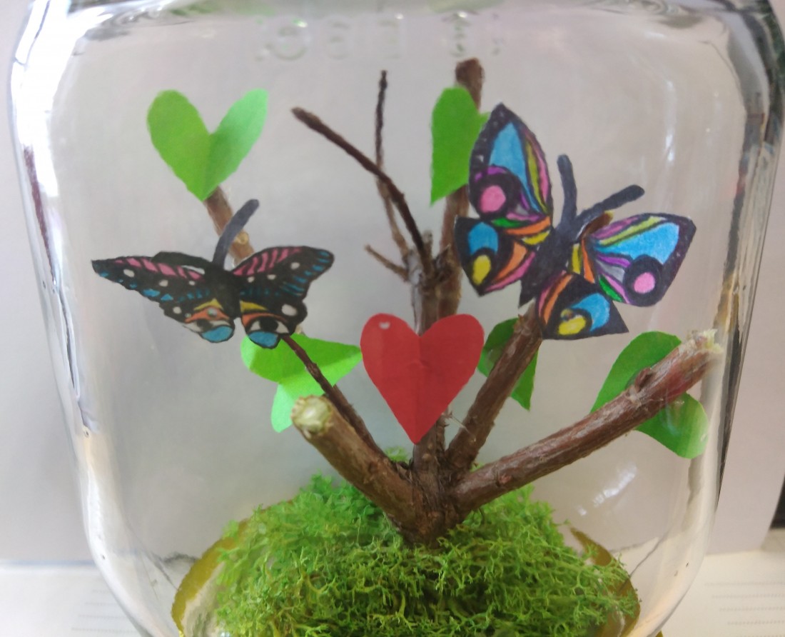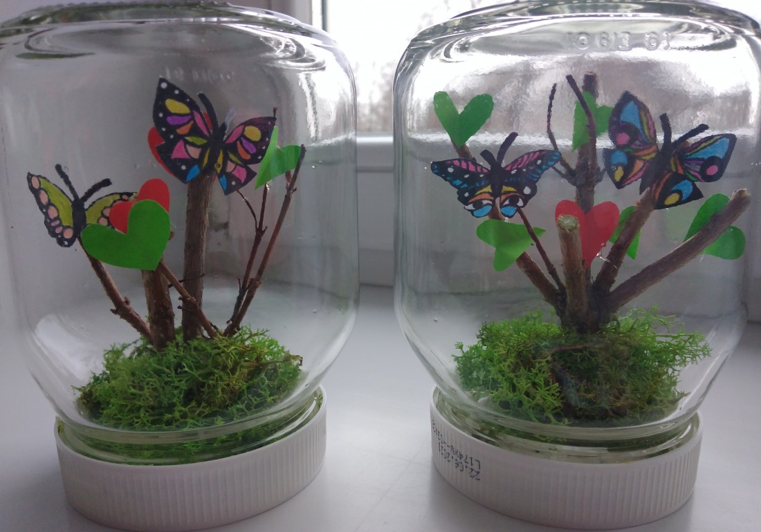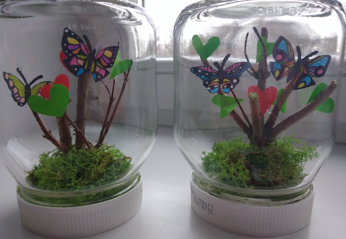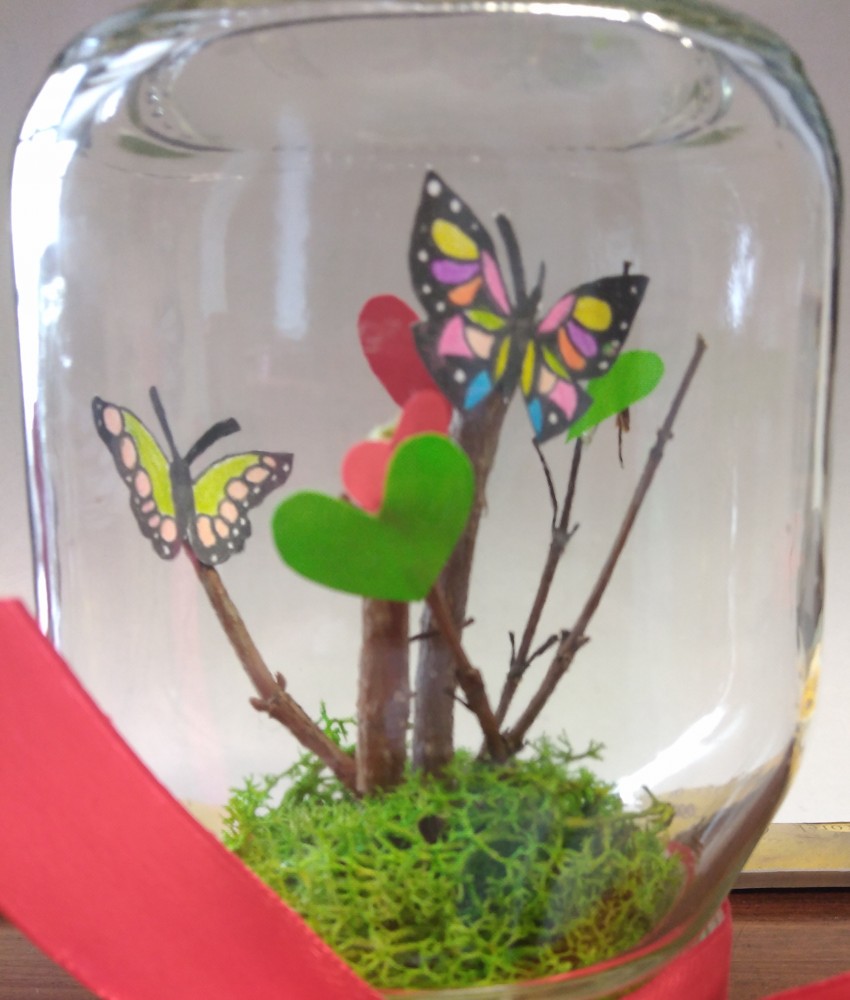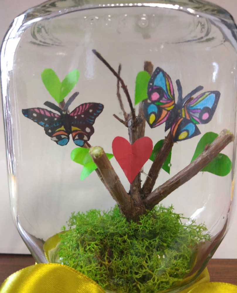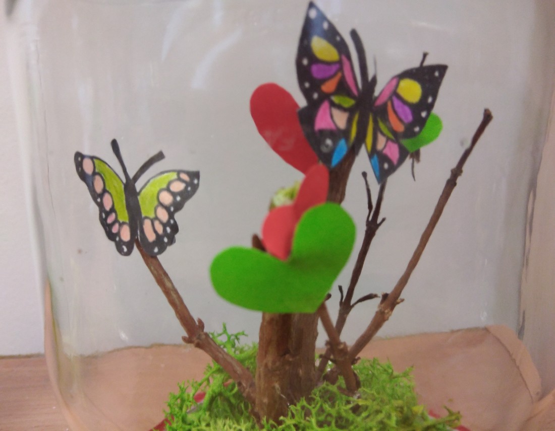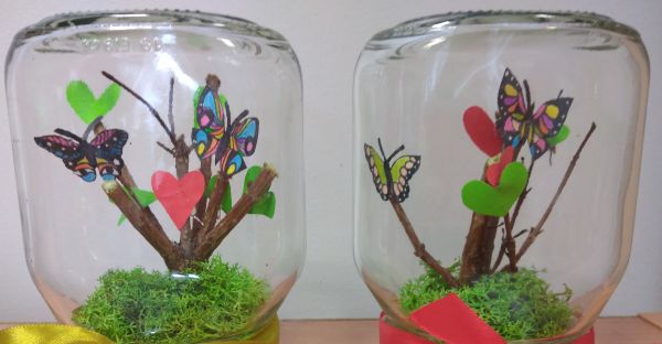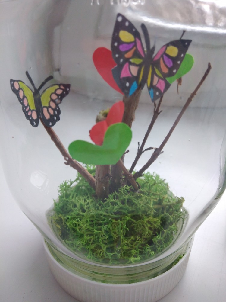 Materiały: dowolny słoik (my wykorzystaliśmy słoik po największej nutellii), kolorowe papiery, gałązki, gąbka florystyczna lub styropian, magiczny klej, chrobotek (mech florystyczny) lub tniemy na paseczki bibułę.